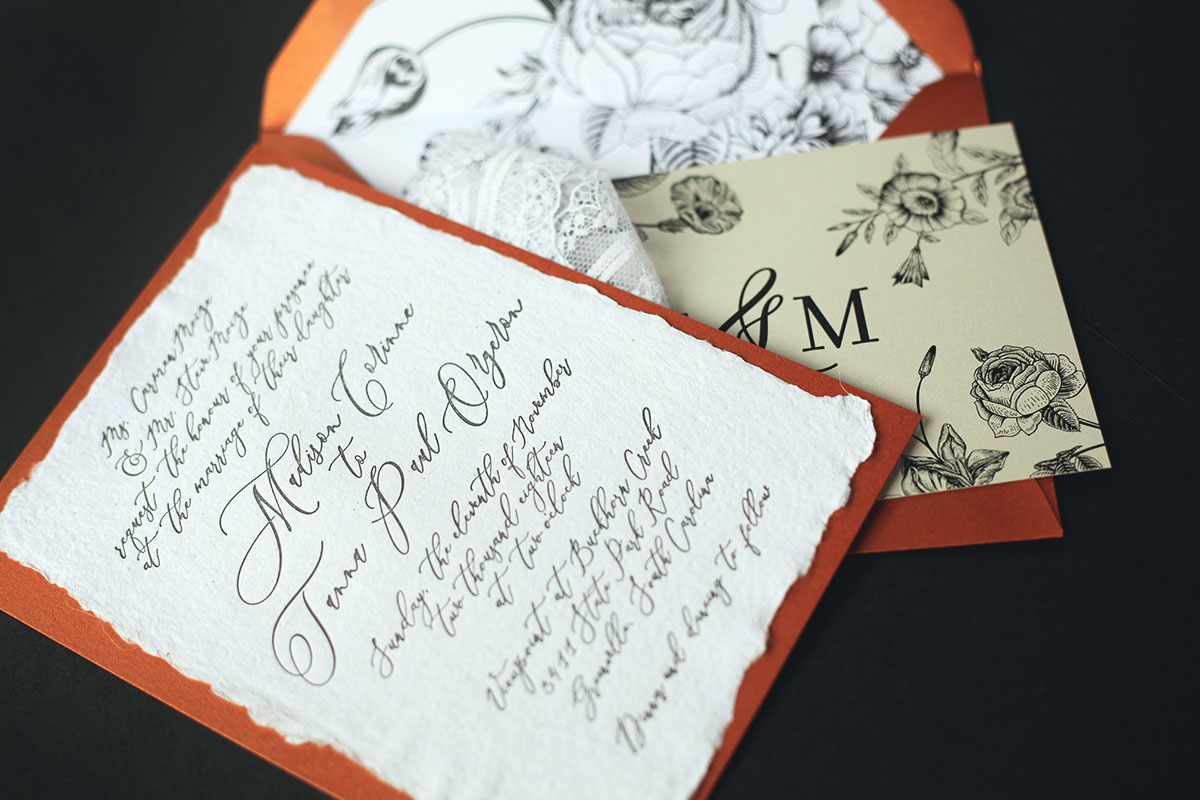 This bride and groom were visionaries. They knew they wanted copper combined with handmade paper and a loose calligraphy font for their wedding invitations. We introduced the lace, the wax stamp, and the shimmery card stock…..to create a completely unique and memorable invitation suite. Take a look at the results below.