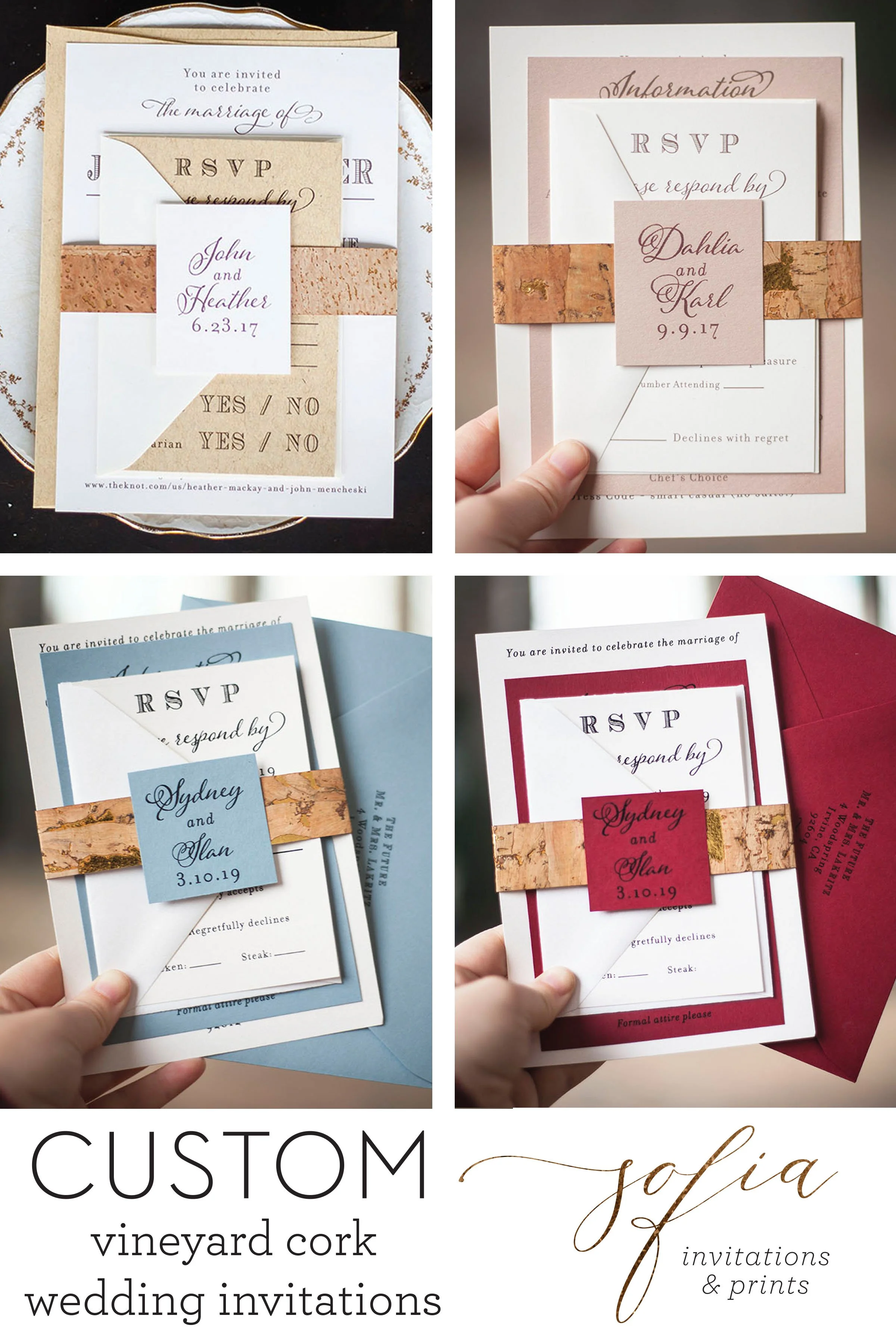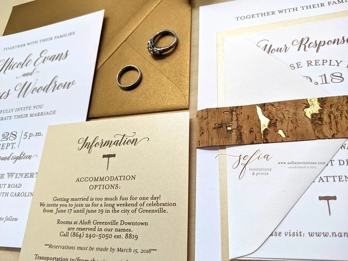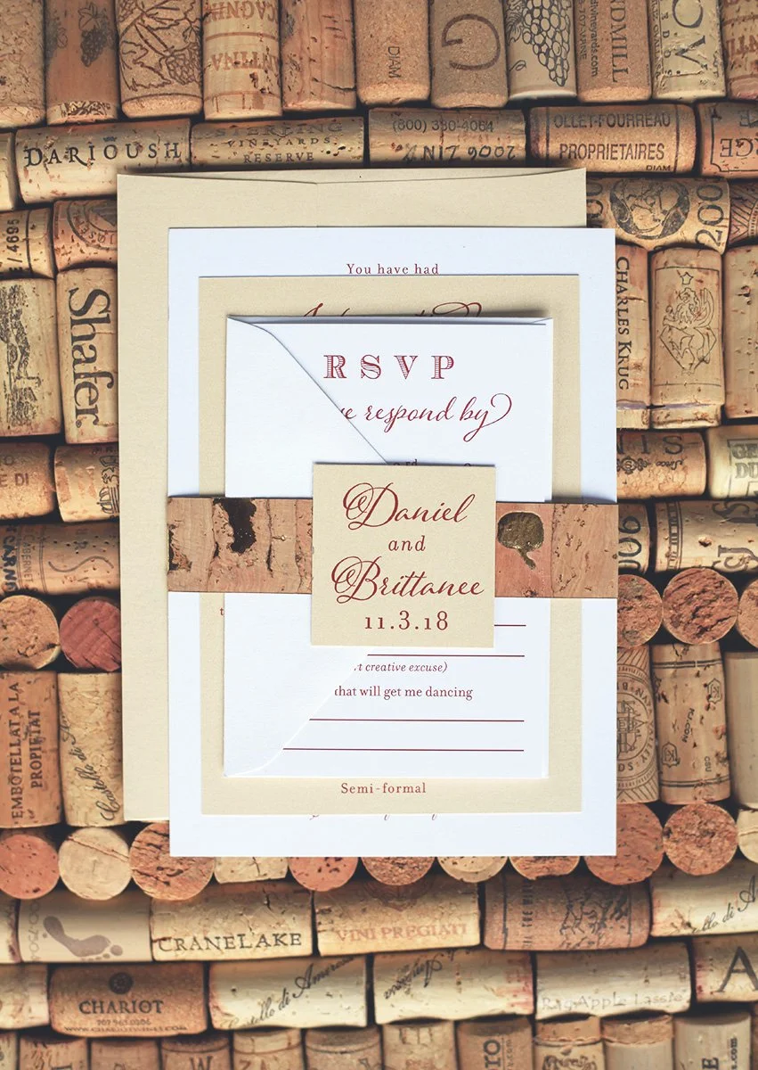 A cork belly band wrapped a wedding invitation is perfect for a wine themed vineyard wedding. This cork paper band has gold metallic flecks in it.